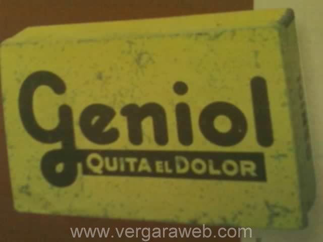 Un típico analgésico que durante los años 20 , 30 y aun después, hiciera "roncha" como se dice vulgarmente, en la sociedad uruguaya. Fue un medicamento que identificó una época, incluso no se pedía un analgésico para el dolor de cabeza, se pedía directamente un Geniol.- Su promoción en el año 1926, dio lugar a que el genial dibujante francés Lucien Achille Mauzan , quien falleciera en 1952 en la Argentina, creara la cabeza del "peladito", con una suerte de clavos, tornillos, sacacorchos, etc. incrustados en el cuero cabelludo. Y una alfiler incrustada en la nariz