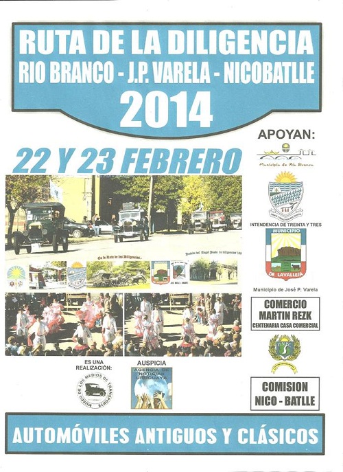 HORA 14..30 PARTIMOS DE REGRESO DESDE BATLLE RUMBO A RIO BRANCO''SEGUNDA EDICION''RUTA DE LA DILIGENCIA'''ORGANIZA MUSEO MEDIOS DE TRANSPORTE DE RIO BRANCO''AUSPICIAN''RADIO RIO BRANCO''F.M. MEGA DE VERGARA''DIFUSORA 33''INFOIDEAS DE VARELA''F.M. HORIZONTE DE ZAPICAN''96.5 F.M. CERRO NICO PEREZ'''Y RADIO BATLLE Y ORDONEZ 1460..A.M