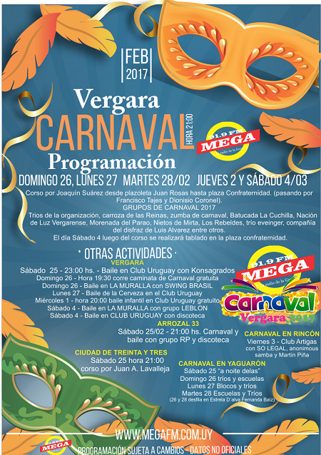 En Mega FM 91.9 les contamos todas las novedades del Carnaval en Vergara y la región, fotos, vídeos, todo lo que sucede en el Carnaval de Vergara, Rincón, Treinta y Tres, Yaguarón y mucho más.