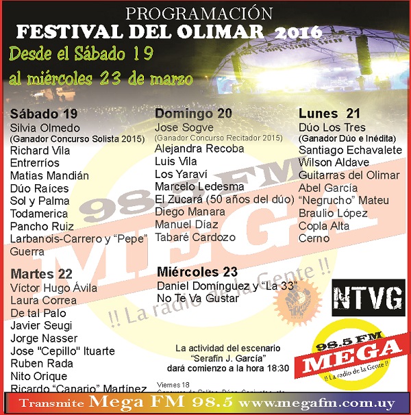 La comisión organizadora del Festival a Orillas del Olimar maestro Rúben Lena, evento a realizarse entre los días sábado 19 al miercoles 23 de marzo de 2016 en el parque del Río Olimar dde la ciudad de Treinta y Tres dio a conocer la programación de la edición número 44°